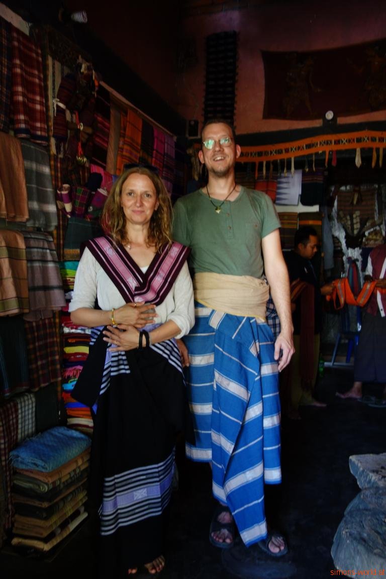 Es dauerte nicht lange bis wir beide in traditionelle Hochzeitsgewänder eingepackt wurden. Nicht schlecht. Ein Vorteil war dass ich Maggy dabei hatte. So überließ ich schlussendlich ihr das shoppen und relaxte mit einer Zigarette und einem Eistee. Wofür die bei den tropischen Temperaturen hier einen Schal verkaufen war mit zwar rätselhaft, Maggy kann ihn in der Schweiz aber sicherlich gut gebrauchen. Es ging wieder auf die Motorräder und weiter zum nächsten Shop.