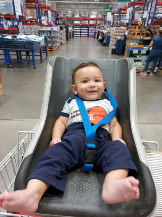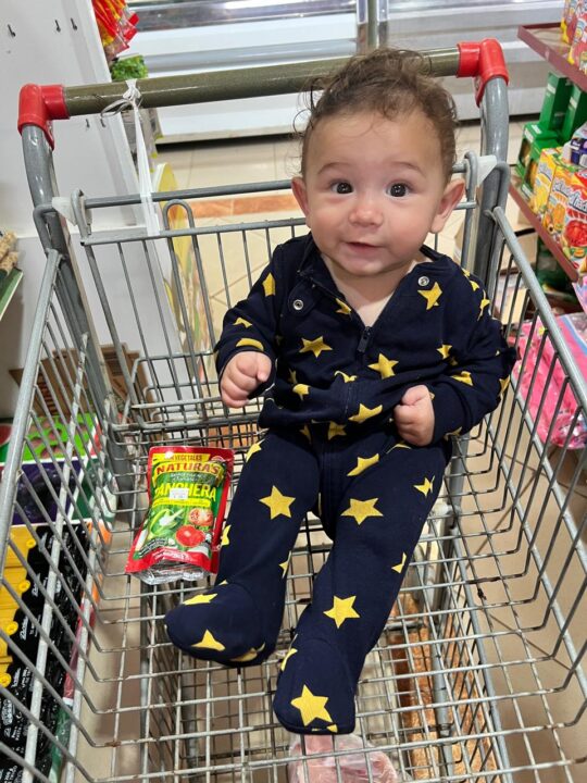Einmal im Monat geht es auch nach Santiago, wo wir den Großteil unserer Lebensmittel einkaufen. Obwohl wir bei so einem Trip gleich mal fünf bis sechs Stunden unterwegs sind, ist er dabei meistens super happy. Klar, wir sind in Bewegung. Als erstes kommt natürlich die lange Autofahrt. Im Kindersitz des Einkaufswagens geht es dann weiter, wo er sich sichtlich wohl fühlt.