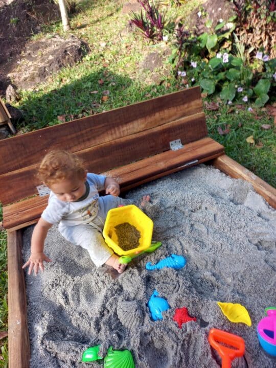 Auch den Kinderwagen haben wir schon von der Liege- auf die Sitzposition umgebaut. Und obwohl unsere Straßen nicht ideal dafür sind, ist Yuly oft mit ihm im Kinderwagen unterwegs. Jetzt bald kommt ja wieder die Trockenzeit, hier auch bekannt als Sommer. Somit werden wir wieder vermehrt am Fluss sein. Um die Zeit bis dahin zu verkürzen, habe ich für klein Simon noch schnell einen Sandkasten gebaut.