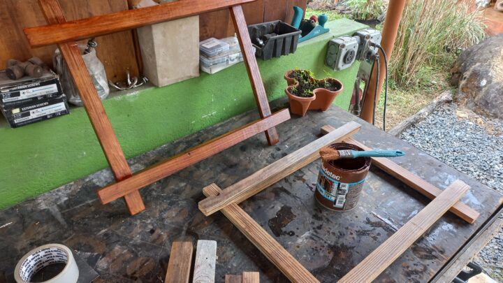 Von denen haben wir tatsächlich dutzende mitgenommen, natürlich aber ohne Rahmen. So kam dann auch der Bedarf nach passgenauen Bilderrahmen zustande. Verwendet habe ich dafür recyceltes Holz von Paletten und alten Schalungen. Ein wenig abgeschliffen und dann lasiert brachte es genau den gewünschten Look.