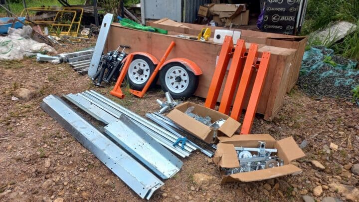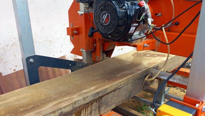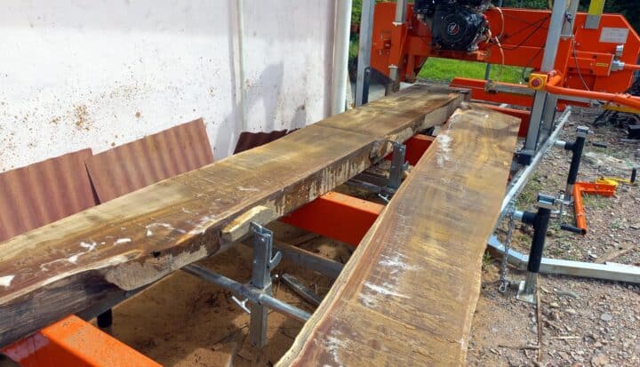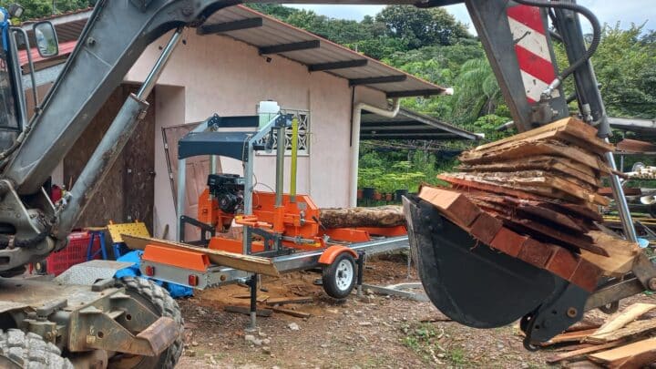 Außer der Verpackung war aber glücklicherweise nichts zu Bruch gegangen und so konnte ich am nächsten Morgen direkt mit dem großen Puzzle beginnen. Die von einem Benzinmotor angetriebene Bandsäge läuft auf einem massiven Stahlrahmen, der in unserem Fall noch einmal auf einem Anhänger montiert ist. Mit einer Länge von fünf Metern und einem maximalen Stammdurchmesser von 70cm können wir damit ganz ordentlich Holz verarbeiten.