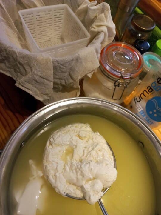So begann ich schon nach kurzer Zeit mit den ersten Experimenten. Als erstes probierte ich nach amerikanischem Rezept einen Frischkäse herzustellen. Dabei wird die Milch kurz aufgekocht und durch Zugabe von Essig oder Zitronensäure zum Stocken gebracht. Die Masse wird abgeschöpft, abgetropft und in Form gepresst.