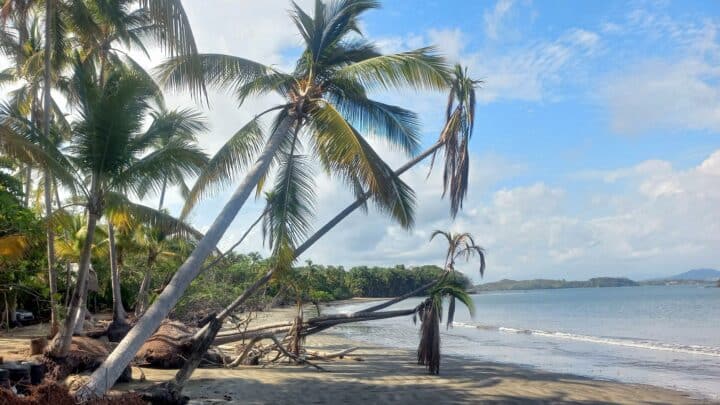 Noch ein paar Kilometer weiter südlich, nämlich beim Playa Bejuco bzw. beim Punta Bejuco gefiel es uns schlussendlich am besten. Hier war nicht nur der begehrte Sandstrand mit dem korrekten Gefälle anzutreffen, sondern auch jede Menge der für einen Touristenstrand obligatorischen Palmen. Obwohl mitten in der Trockenzeit, muss das Wetter hier kürzlich ziemlich übel gewesen sein. Zahlreiche umgefallene Palmen zeugten noch davon.