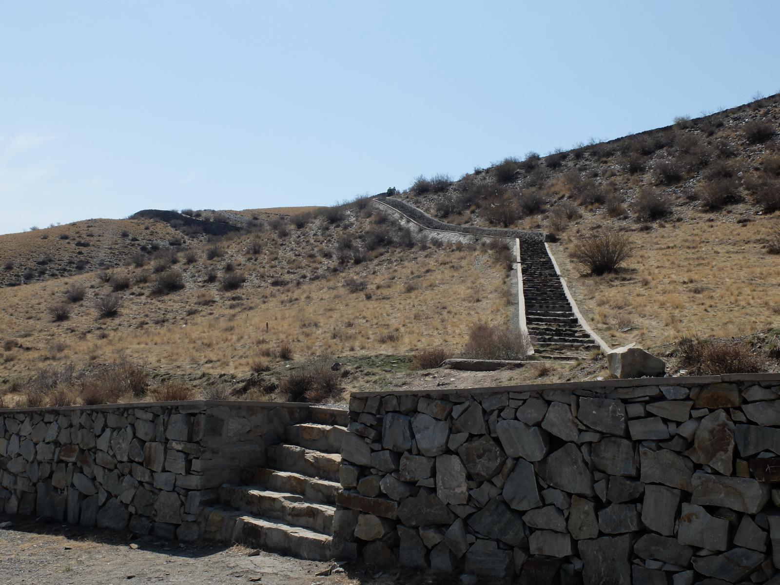 Ein wenig außerhalb der Stadt machten wir dann einen kurzen Stopp bei der Qinzeitlichen Großen Mauer von Guyang. Dieser Mauerabschnitt ist wesentlich älter, niedriger und schmaler als das Stück, welches wir gestern Nähe Peking besucht hatten. Wir waren einsam und alleine, er herrschte eine herrliche Ruhe. Chaolu erzählte uns ein paar Geschichten rund um die Mauer und die Kriege, die hier damals geführt wurden.