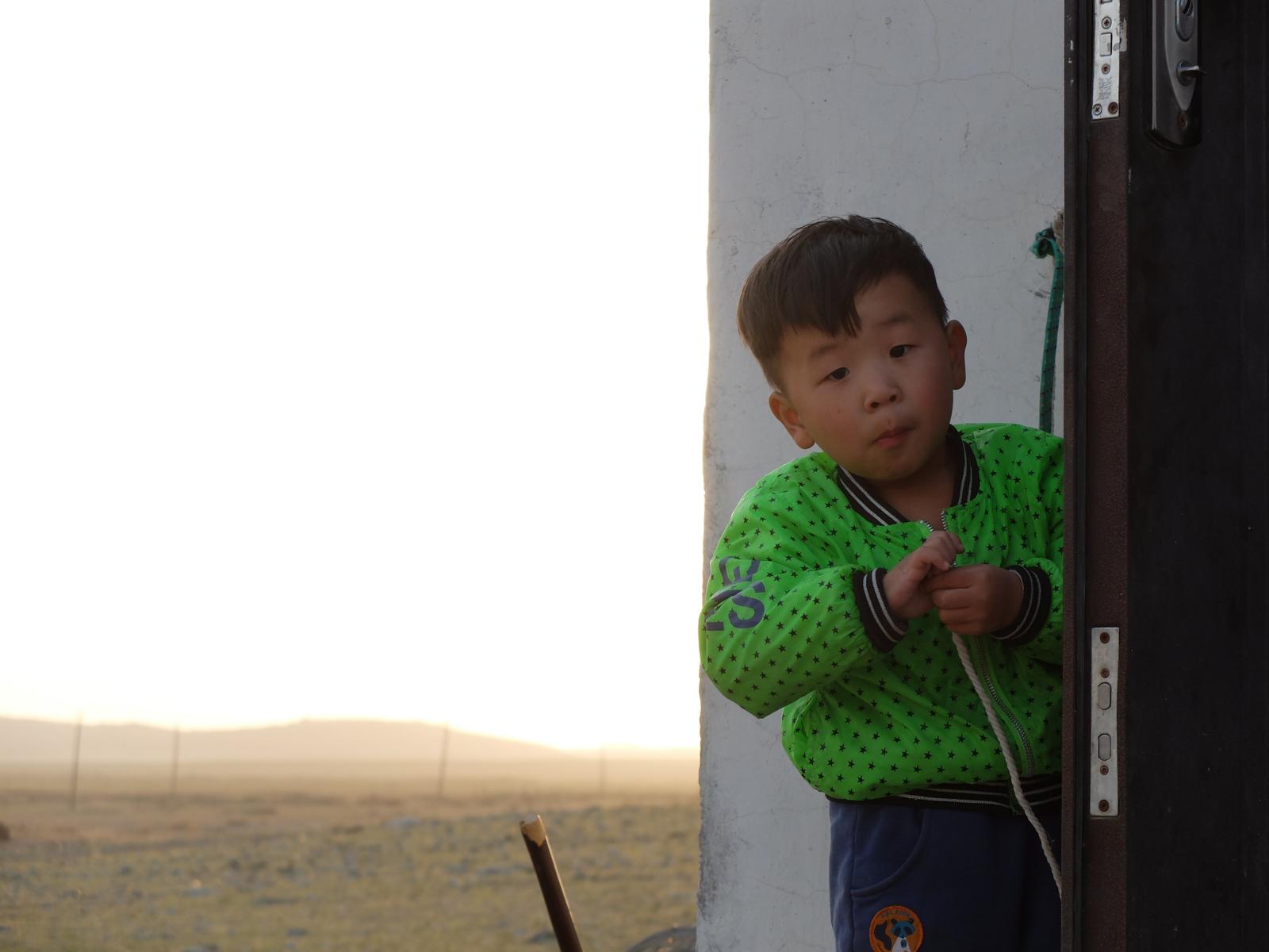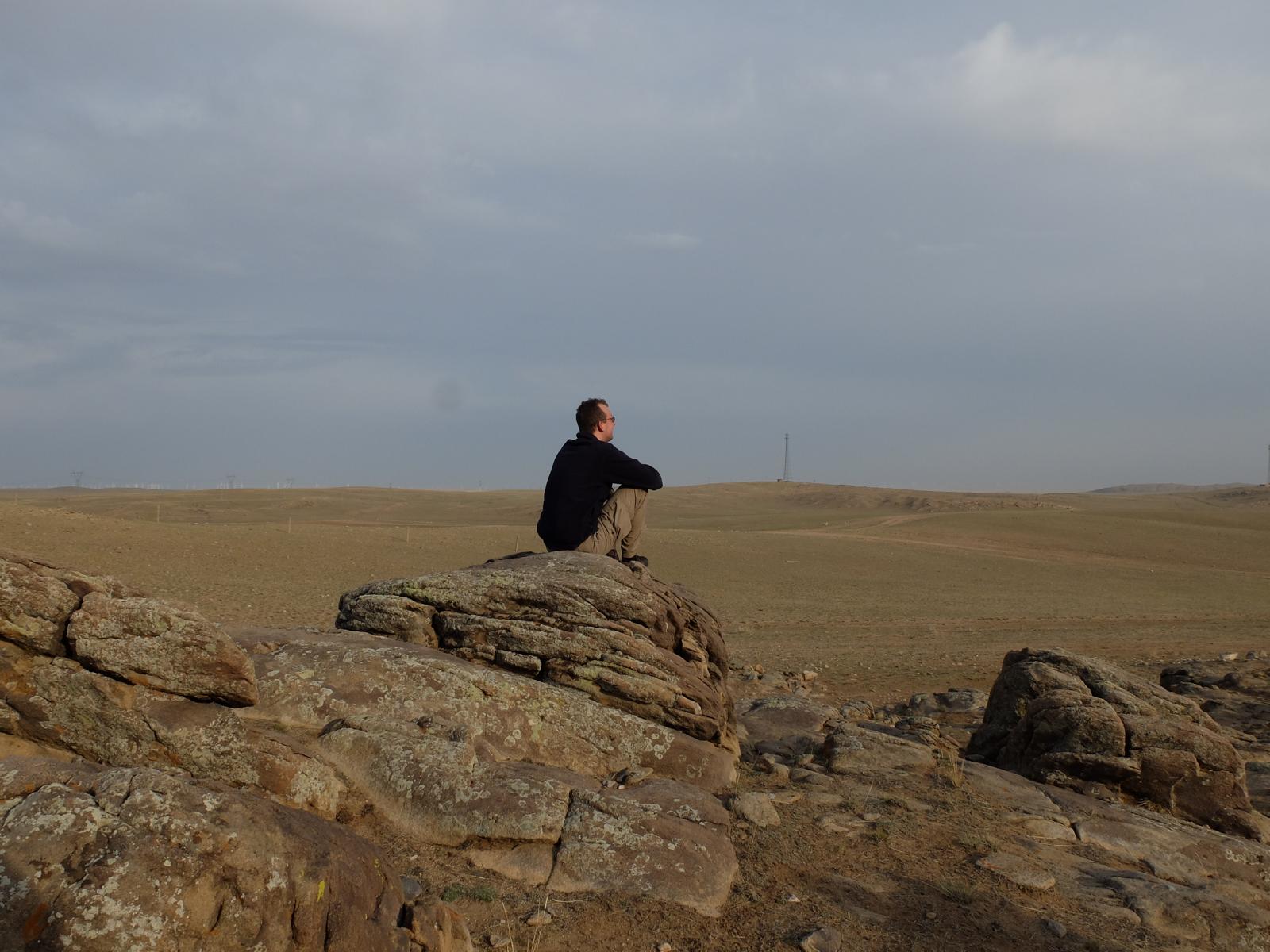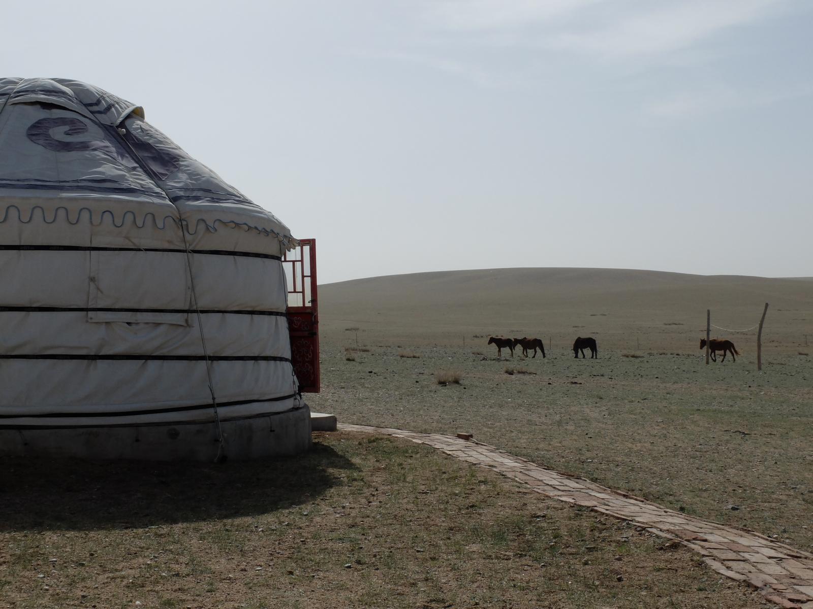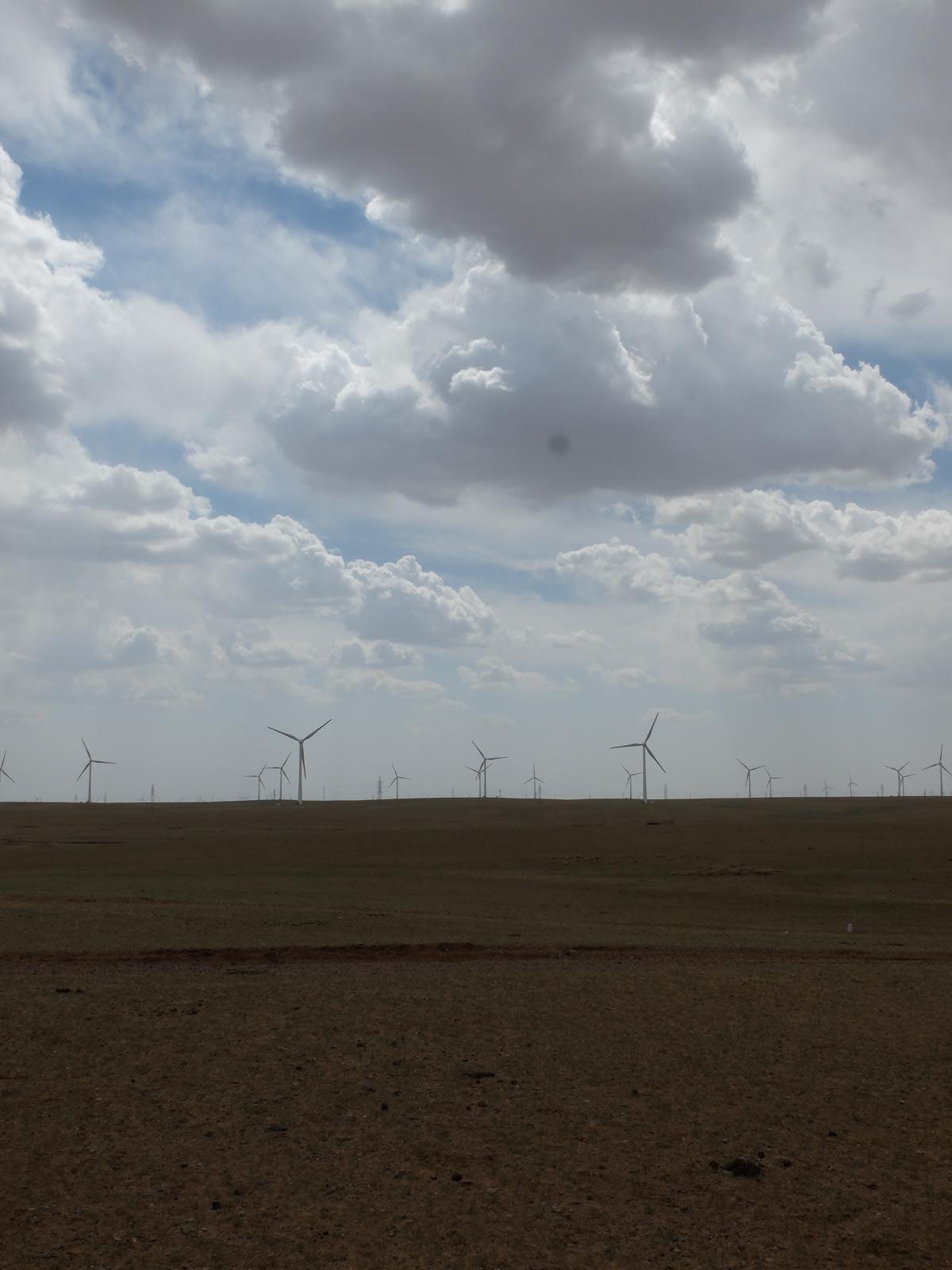 Zurück beim Homestay erfuhren wir ein bisschen mehr über die Menschen hier. Die Mongolen sind ein sehr naturverbundenes Volk. Die Farben der Jurten (blau und weiß) repräsentieren den Himmel und die Wolken. Das Zeichen auf dem Dach symbolisiert die Waffe Dschingis Khan’s. Außerdem essen die Menschen hier fast ausschließlich Fleisch. Etwas später spazierte ich dann auf den Hügel um mir ein besseres Bild von der Umgebung zu machen. Faszinierend. Grasland soweit das Auge reicht, am Horizont ein Wald aus Windrädern. Na wenigstens haben die Mongolen hier Ökostrom. Aber nicht nur sie, denn ein Großteil des Stroms geht an die energiehungrigen Städte im Süden.