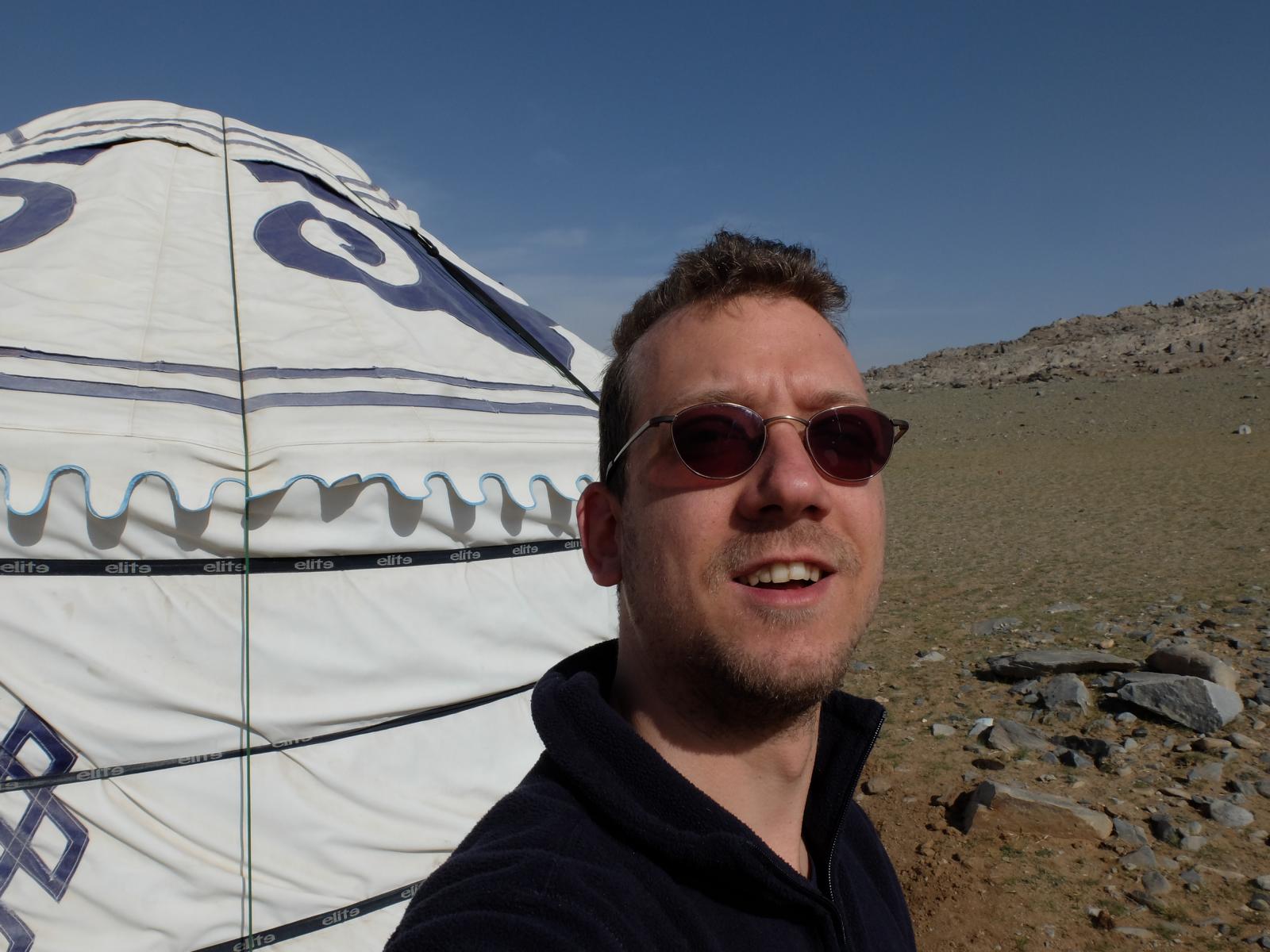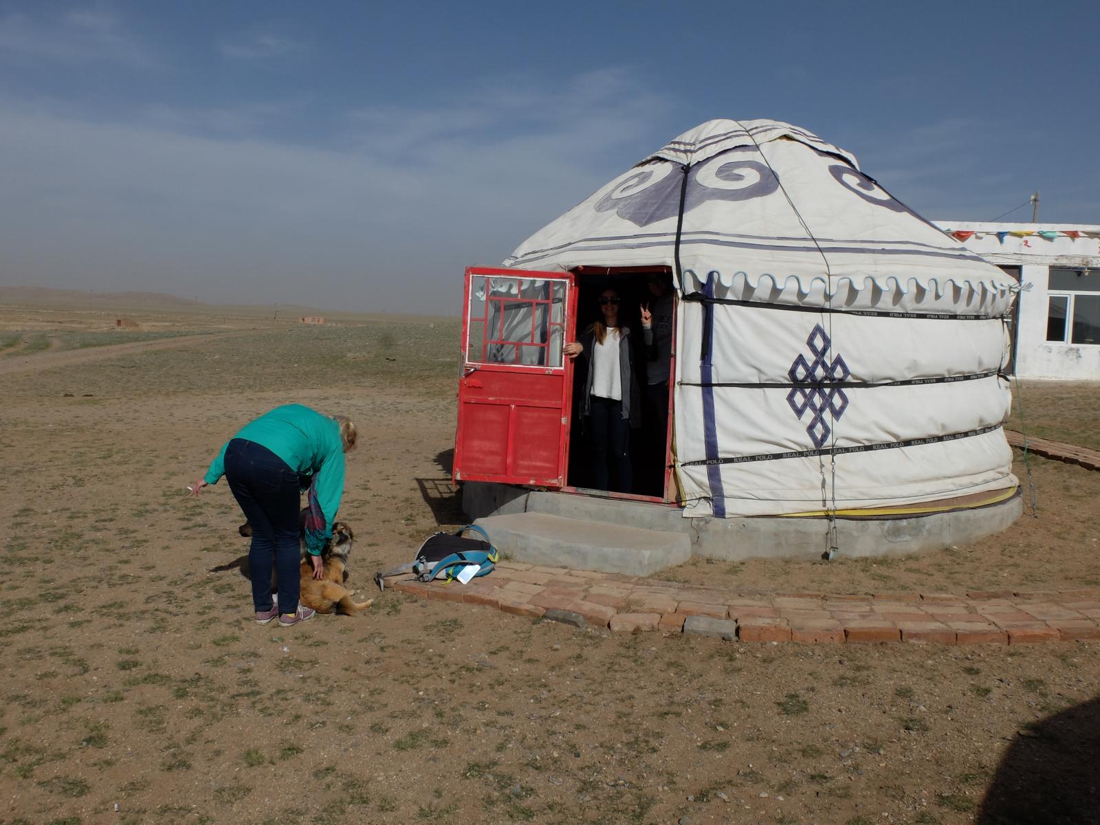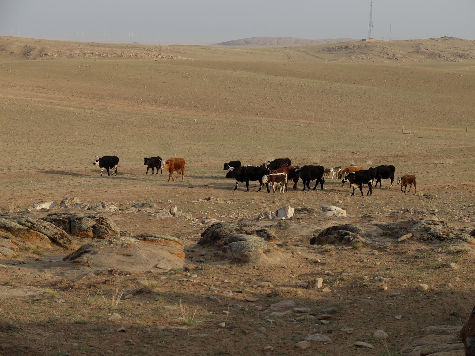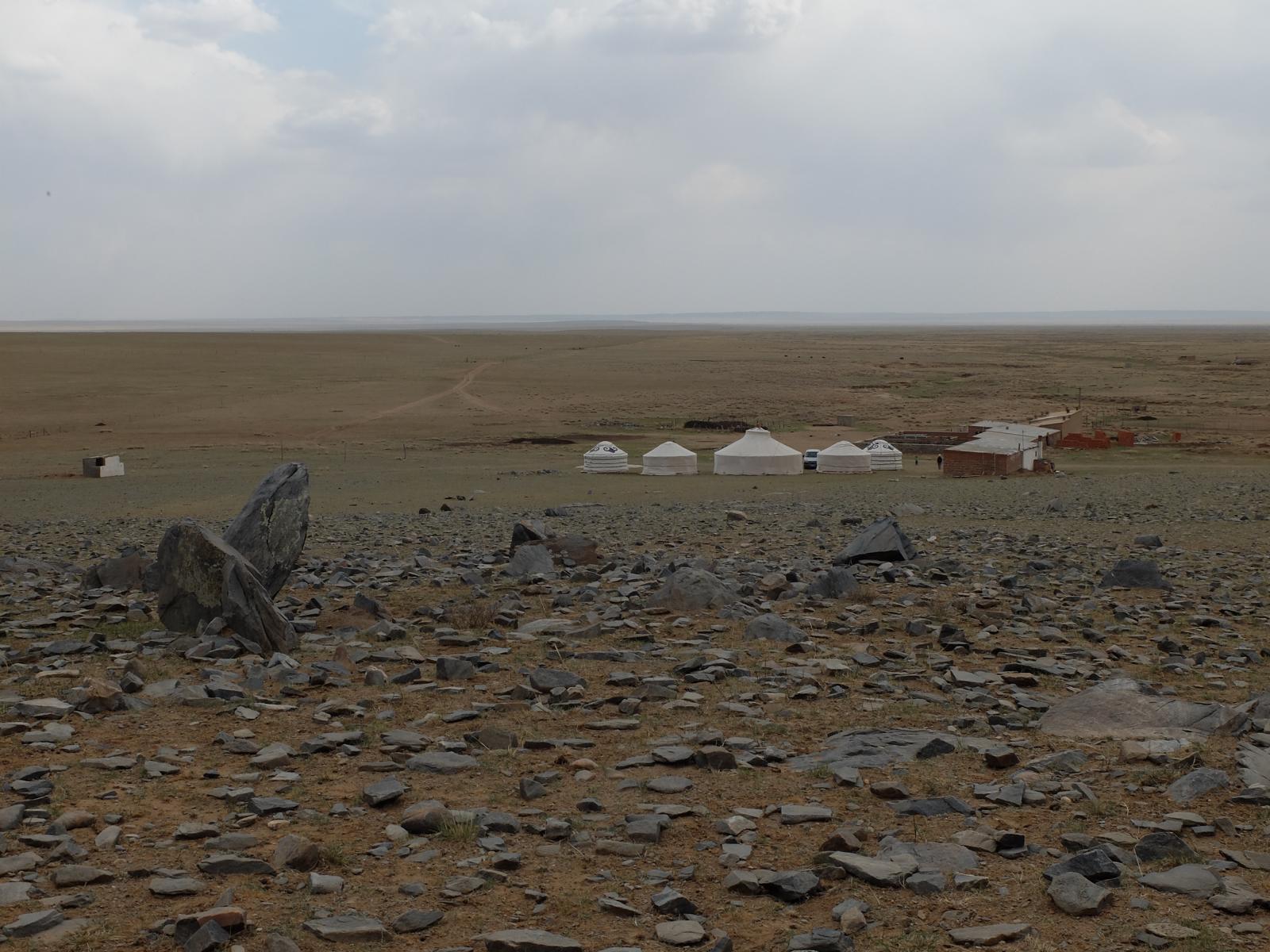 Frisch gestärkt ging es dann weiter Richtung Norden. Nach kurzer Zeit waren wir umringt von Windrädern und es ging auf einer unbefestigten Straße quer durch die Steppe. Es war eine seltsame Atmosphäre dort. Schafe, Ziegen, Pferde und wohl tausende Windräder 360° soweit das Auge reichte. Nach einer Stunde querfeldein erreichten wir schließlich unsere heutige Unterkunft. Mitten im nirgendwo, im Schatten des „Black Mountain“ (eher ein steiniger Hügel) befanden sich ein paar Jurten und die Ställe unserer Gastgeber. Heute Nacht werden wir hausen wie echte Mongolen.